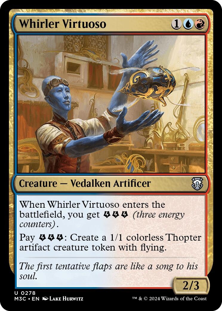 When Whirler Virtuoso enters the battlefield, you get EEE (three energy counters).